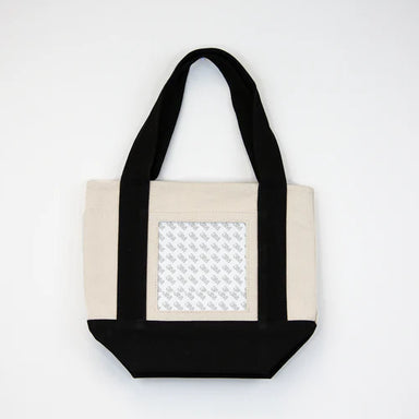 Canvas tote with 5 inch insert opening Tote measures 10” wide, 10” tall, 8” drop on the straps and 4” wide base. One deep pocket on the back.