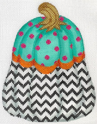 $126.00| /Funky Punkin Stand-up #10 – turquoise top w/ fuchsia polka dots, black/white zigzag bottom SST-265 4.5 x 5.75 18M Kate Dickerson Needlepoint