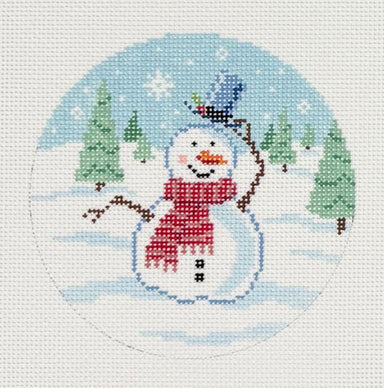 Frosty Loves Tobogganing DK-23 Canvas 18 count 4" Round 8w x 8h A collaboration with Dave Klug, Pittsburgh Illustrator & Artist for Lauren Bloch