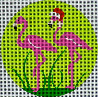 Flamingos w/SG SP-36 4.5" round 18 count mesh Designed by Scott Partridge for VNG Canvas