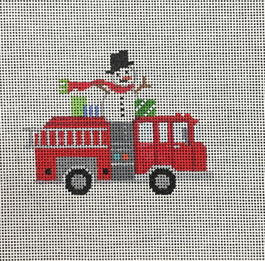 Firetruck with Snowman AL-068 4" rnd on 18 mesh Vallerie Needlepoint Gallery